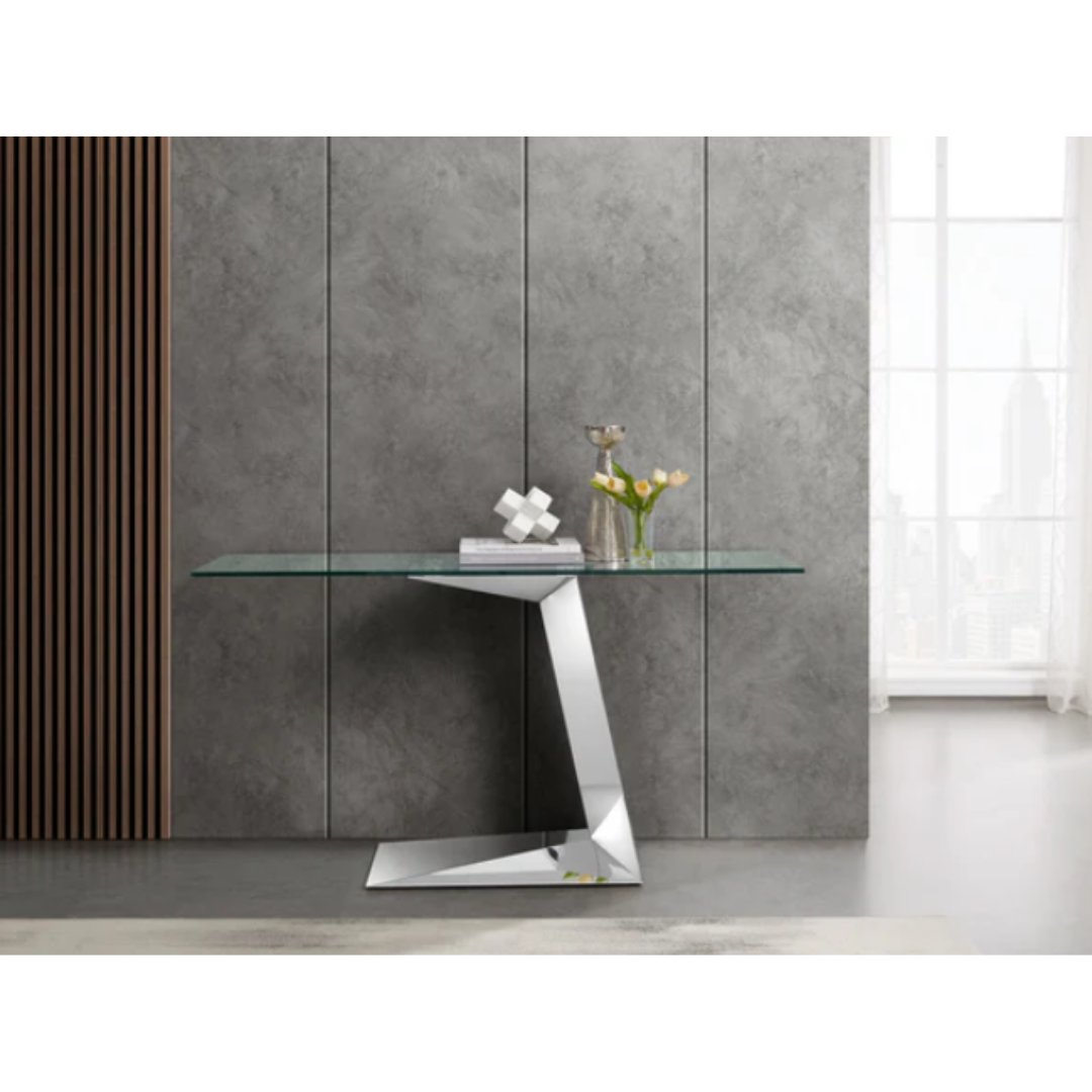 The Cecilia console table in stainless glass offers a blend of adaptable style and comfort boasting a modern design that seamlessly complements your home decor.